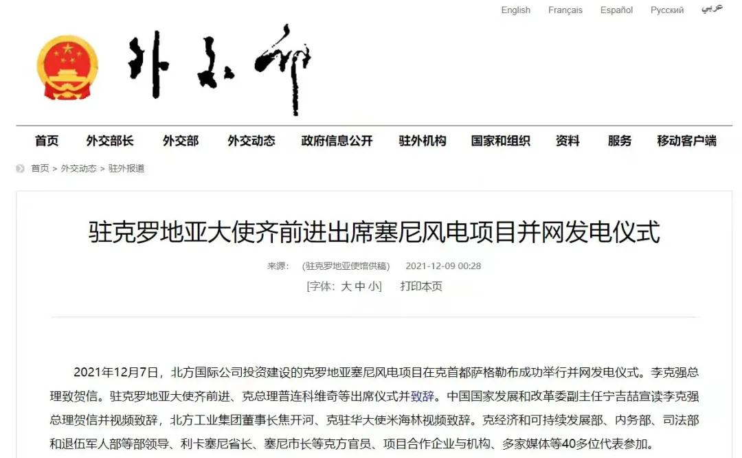 2021年12月7日,中國兵器工業(yè)集團(tuán)有限公司北方公司所屬北方國際投資、建設(shè)和運(yùn)營的塞尼156MW風(fēng)電項(xiàng)目在克羅地亞首都薩格勒布隆重舉行并網(wǎng)發(fā)電儀式。李克強(qiáng)總理致賀信??肆_地亞總理安德烈·普連科維奇,中國駐克羅地亞大使齊前進(jìn)出席儀式并致辭。中國國家發(fā)展和改革委員會(huì)副主任寧吉喆宣讀李克強(qiáng)總理賀信并視頻致辭,中國兵器工業(yè)集團(tuán)有限公司董事長焦開河、克駐華大使米海林視頻致辭。 中華人民共和國外交部報(bào)道 普連科維奇總理在致辭中表示,感謝李克強(qiáng)總理發(fā)來賀信,他與中國領(lǐng)導(dǎo)人一直非常重視塞尼風(fēng)電項(xiàng)目投資與建設(shè)。祝賀項(xiàng)目克服疫情與地震等影響,成功并網(wǎng)發(fā)電。增加清潔可再生能源、綠色電力對克乃至歐洲都很重要,克政府的重要戰(zhàn)略和目標(biāo)之一就是低碳發(fā)展和增加清潔能源供應(yīng)。塞尼風(fēng)電項(xiàng)目占克總發(fā)電量將達(dá)3.5%,對克實(shí)現(xiàn)2022年可再生能源比例30%目標(biāo)具有很大幫助。此次投資使北方國際成為在克最大的清潔能源投資企業(yè)。非常歡迎更多中國企業(yè)擴(kuò)大對克投資。 寧吉喆宣讀李克強(qiáng)總理賀信并視頻致辭時(shí)表示,2017年11月第六次中國—中東歐國家領(lǐng)導(dǎo)人會(huì)晤期間,在李克強(qiáng)總理和普連科維奇總理等中東歐16國領(lǐng)導(dǎo)人的共同見證下,塞尼項(xiàng)目簽署了協(xié)議。項(xiàng)目既是中國堅(jiān)定踐行綠色發(fā)展理念的具體體現(xiàn),也是中國深化與克羅地亞、與中東歐國家務(wù)實(shí)合作的生動(dòng)實(shí)踐。希望中克兩國政府部門,企業(yè)等有關(guān)各方共同努力、相互配合,運(yùn)營好塞尼項(xiàng)目,打造出中歐綠色合作的樣板,帶動(dòng)兩國務(wù)實(shí)合作持續(xù)深入發(fā)展,造福兩國人民。 焦開河在致辭時(shí)表示,在塞尼項(xiàng)目投入運(yùn)營之際,李克強(qiáng)總理專門致信祝賀。作為塞尼項(xiàng)目的投資方、建設(shè)方、運(yùn)營方,我們備受鼓舞,深感自豪!未來,中國兵器工業(yè)集團(tuán)有限公司將繼續(xù)深入貫徹落實(shí)習(xí)近平總書記重要指示批示精神和李克強(qiáng)總理賀信重要要求,以高標(biāo)準(zhǔn)、可持續(xù)、惠民生為目標(biāo),與克方合作伙伴坦誠溝通、攜手并進(jìn),進(jìn)一步推動(dòng)綠色能源建設(shè),努力打造更多的“一帶一路”標(biāo)志性、引領(lǐng)性、示范性項(xiàng)目,為鞏固中克戰(zhàn)略合作伙伴關(guān)系、推進(jìn)中克從經(jīng)貿(mào)領(lǐng)域到全方位合作貢獻(xiàn)積極力量。 齊前進(jìn)祝賀塞尼風(fēng)電項(xiàng)目順利完工和成功并網(wǎng)發(fā)電。他表示,塞尼風(fēng)電站項(xiàng)目并網(wǎng)發(fā)電是中克兩國領(lǐng)導(dǎo)人親自關(guān)注和推動(dòng)的成果。作為迄今最大的中國在克投資合作項(xiàng)目,塞尼風(fēng)電項(xiàng)目是中克和中歐綠色合作的典范,對克提高清潔能源生產(chǎn)消費(fèi)發(fā)揮著重要作用。項(xiàng)目建設(shè)過程中為當(dāng)?shù)嘏囵B(yǎng)了許多工程、技術(shù)和管理人才,帶動(dòng)了當(dāng)?shù)仄髽I(yè)發(fā)展,增加了就業(yè)和稅收,促進(jìn)了當(dāng)?shù)亟?jīng)濟(jì)社會(huì)發(fā)展,充分體現(xiàn)了中國對外經(jīng)貿(mào)合作與“一帶一路”倡議秉持的互利共贏、共同發(fā)展的理念,也是中國積極倡導(dǎo)的綠色低碳發(fā)展合作的典范。 塞尼項(xiàng)目位于克羅地亞中部亞得利亞海沿岸,建設(shè)總投資1.79億歐元,總裝機(jī)容量156MW,采用39臺(tái)4MW風(fēng)力發(fā)電機(jī)組設(shè)備,風(fēng)場面積達(dá)42.8平方公里。項(xiàng)目正式運(yùn)營后,預(yù)計(jì)每年平均發(fā)電超3000小時(shí),貢獻(xiàn)約5.3億度綠色電力,可減少二氧化碳排放約46萬噸,將為克羅地亞促進(jìn)能源轉(zhuǎn)型、發(fā)展綠色經(jīng)濟(jì)提供強(qiáng)勁助力,貢獻(xiàn)了“中國智慧”“中國方案”。 來源/中華人民共和國外交部、綜合有關(guān)報(bào)道 |