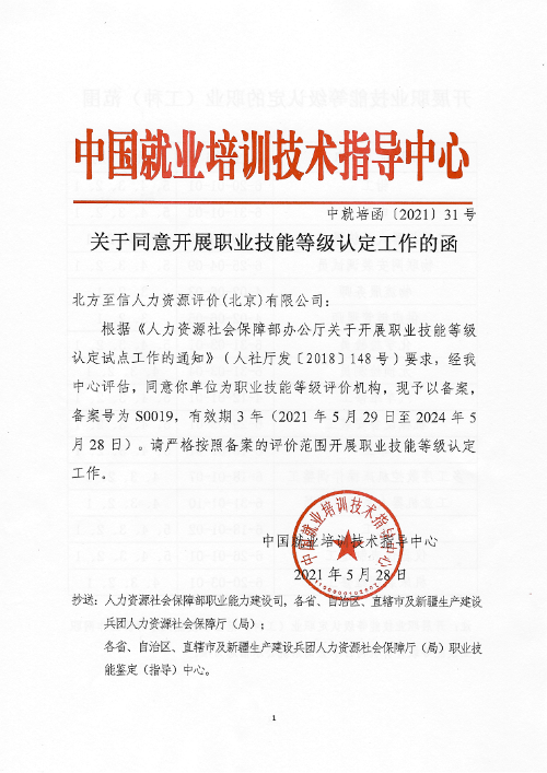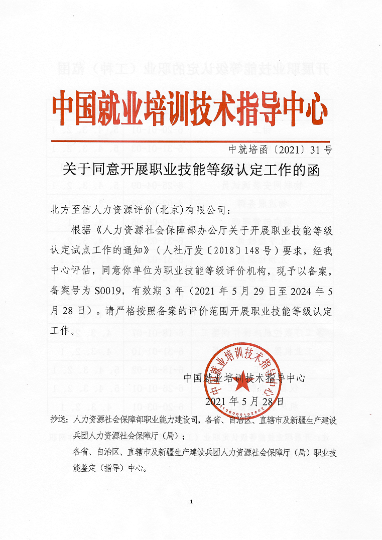 5月28日,人力資源社會保障部中國就業(yè)培訓(xùn)技術(shù)指導(dǎo)中心發(fā)布了《關(guān)于同意開展職業(yè)技能等級認(rèn)定工作的函》(中就培函〔2021〕31號),北方至信人力資源評價(jià)(北京)有限公司(以下簡稱“北方至信”)成為首家央企全國性社會培訓(xùn)評價(jià)組織職業(yè)技能等級認(rèn)定機(jī)構(gòu)。