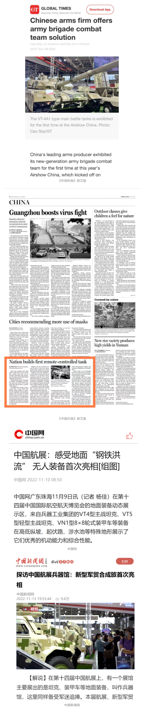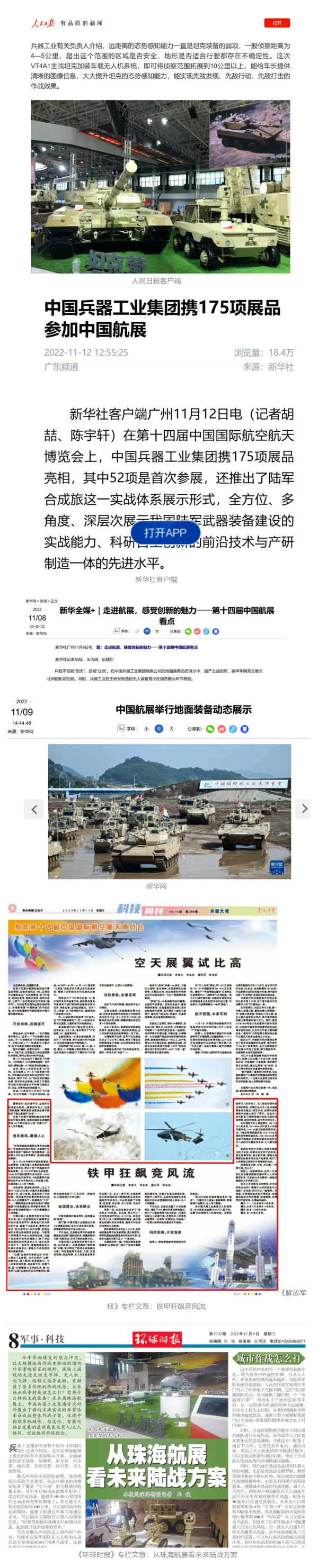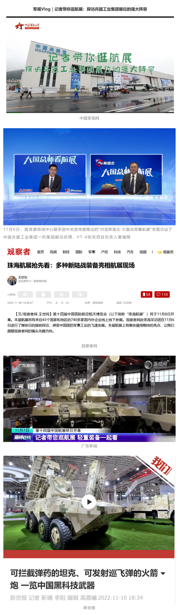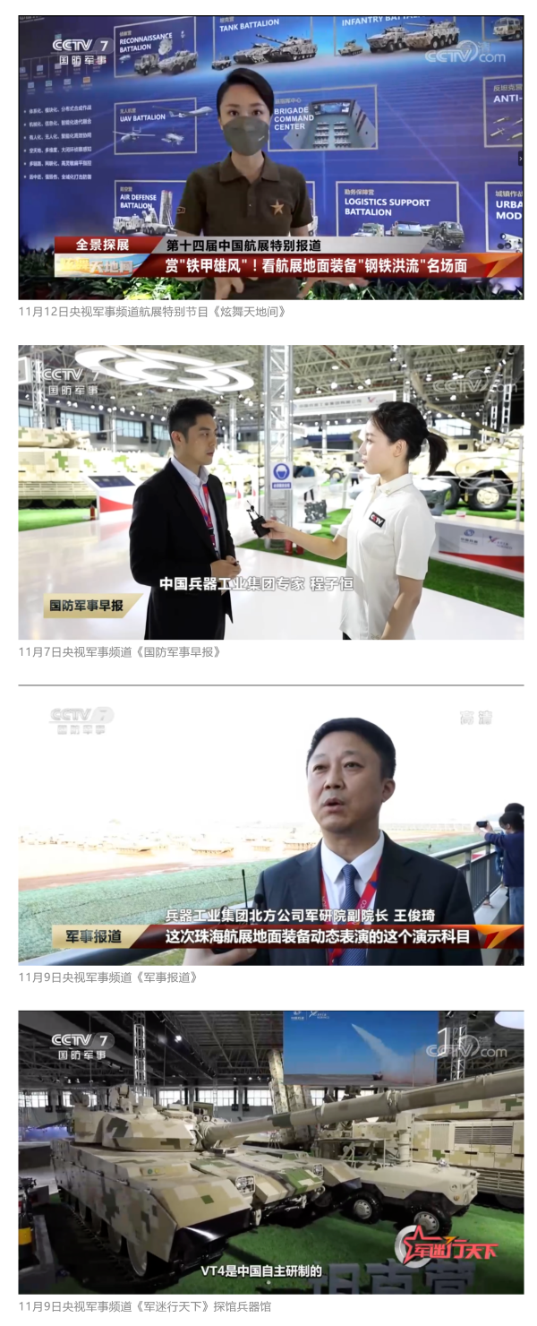 央視國(guó)防軍事頻道航展特別報(bào)道《炫舞天地間》11月12日《賞“鐵甲雄風(fēng)”!看航展地面裝備“鋼鐵洪流”名場(chǎng)面》對(duì)兵器工業(yè)集團(tuán)武器裝備特色亮點(diǎn)進(jìn)行報(bào)道。《國(guó)防軍事早報(bào)》11月7日推出報(bào)道《第十四屆中國(guó)國(guó)際航空航天博覽會(huì)明天開幕 中國(guó)兵器館首次以陸軍合成旅實(shí)戰(zhàn)體系形式展出》,對(duì)兵器館陸軍合成旅實(shí)戰(zhàn)體系進(jìn)行報(bào)道?!盾娛聢?bào)道》11月9日推出《第十四屆中國(guó)國(guó)際航空航天博覽會(huì) 地面兵器裝備首次聯(lián)合陸航直升機(jī)進(jìn)行動(dòng)態(tài)展示》報(bào)道?!盾娒孕刑煜隆?1月9日推出報(bào)道《軍迷打卡航展2022》以專業(yè)軍迷視角探館兵器館,全面展示兵器工業(yè)集團(tuán)參展裝備特色亮點(diǎn)。