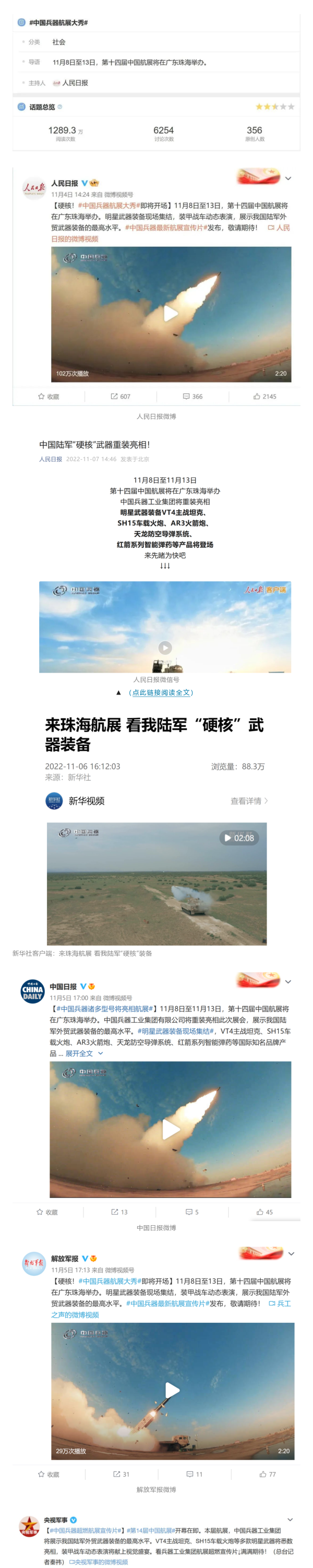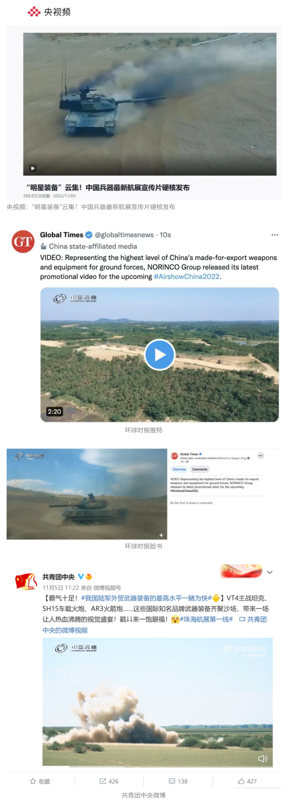 人民日?qǐng)?bào)官方微博、微信公眾號(hào),新華社客戶端、央視新聞客戶端、中國(guó)日?qǐng)?bào)微博、參考消息微信公眾號(hào)、解放軍報(bào)微博、央視軍事微博、CGTN微博、中國(guó)軍號(hào)微博、共青團(tuán)中央微博、環(huán)球時(shí)報(bào)(英文網(wǎng)站、臉書賬號(hào)、推特賬號(hào))、嗶哩嗶哩、學(xué)習(xí)強(qiáng)國(guó)平臺(tái)、國(guó)資小新視頻號(hào)、網(wǎng)易軍事、騰訊軍事、鳳凰軍事、北京日?qǐng)?bào)、東方衛(wèi)視看看新聞全媒體、北京電視臺(tái)等20余家中央主流媒體、國(guó)家部委、省市媒體的新媒體第一時(shí)間播發(fā)集團(tuán)公司航展宣傳片等視頻作品燃爆全網(wǎng),累計(jì)閱讀量突破1700萬(wàn)人次。集團(tuán)公司微信公眾號(hào)、微博、抖音號(hào)、快手號(hào)、微信視頻號(hào)、知乎號(hào)等新媒體宣傳片播放閱讀量超過800萬(wàn)人次,點(diǎn)贊超過30萬(wàn)人次。集團(tuán)公司微信公眾號(hào)推出《硬核!中國(guó)兵器最新航展宣傳片發(fā)布》《中國(guó)兵器航展節(jié)目單,請(qǐng)選出心中明星裝備》《航展首日,中國(guó)兵器閃耀亮相!》等7篇報(bào)道,閱讀量超過25萬(wàn)人次,集團(tuán)公司微信視頻號(hào)、抖音號(hào)、快手號(hào)等新媒體賬號(hào)發(fā)布“中國(guó)兵器航展大秀”系列視頻,觀看量超過330萬(wàn)人次。