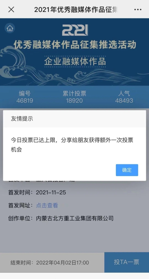 近日,由“文化強(qiáng)國(guó)”光明日?qǐng)?bào)協(xié)同推廣平臺(tái)、光明網(wǎng)、北京師范大學(xué)新媒體傳播研究中心和光明天翼5G融媒實(shí)驗(yàn)室共同主辦的“2021年優(yōu)秀融媒體作品征集推選活動(dòng)”開啟線上投票環(huán)節(jié),經(jīng)過專家委員會(huì)評(píng)審,中國(guó)兵器工業(yè)集團(tuán)北重集團(tuán)《白楊伴我獻(xiàn)國(guó)防》音樂MV入選活動(dòng)前二十名,并進(jìn)入網(wǎng)絡(luò)投票環(huán)節(jié)。 《白楊伴我獻(xiàn)國(guó)防》 楊樹參天 高聳云端的是兵工人 “履行好強(qiáng)軍首責(zé)”的壯志凌云! 深植北疆 傾獻(xiàn)沃土的是北重人 “推動(dòng)高質(zhì)量發(fā)展”的壯志豪情! 白楊樹伴著我們茁壯成長(zhǎng) 見證著我們獻(xiàn)身國(guó)防! 投票方式 1.掃描下方二維碼,進(jìn)入初始界面,點(diǎn)擊“企業(yè)融媒體作品征集”,進(jìn)入投票界面點(diǎn)擊《白楊伴我獻(xiàn)國(guó)防》,點(diǎn)擊“投TA一票”; 2. 每人每日可投10票,直至提示投票達(dá)到上限即可; 3.投票時(shí)間:2022年3月17日09:00-2022年4月2日17:00。 來源/光明網(wǎng)、北重集團(tuán) |