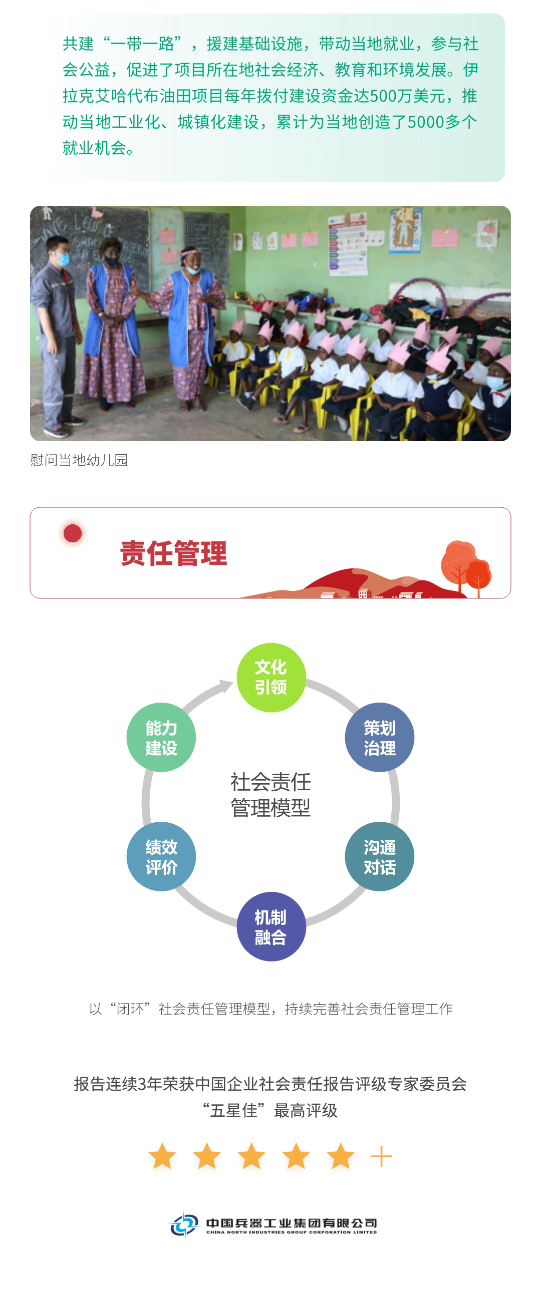 近日,兵器工業(yè)集團(tuán)正式發(fā)布第十三份年度社會(huì)責(zé)任報(bào)告——《中國(guó)兵器工業(yè)集團(tuán)有限公司2021年社會(huì)責(zé)任報(bào)告》,以“用心守護(hù)和平、用力爭(zhēng)創(chuàng)一流、用情溫暖社會(huì)”為主題,從恪守強(qiáng)軍首責(zé)、服務(wù)經(jīng)濟(jì)建設(shè)、共創(chuàng)美好生活三個(gè)維度,向社會(huì)全面披露2021年度履責(zé)實(shí)踐和履責(zé)業(yè)績(jī)?!秷?bào)告》連續(xù)第三年獲得中國(guó)企業(yè)社會(huì)責(zé)任報(bào)告評(píng)級(jí)專家委員會(huì)“五星佳”評(píng)級(jí),兵器工業(yè)集團(tuán)成為軍工行業(yè)唯一連續(xù)11年獲得五星及五星佳最高評(píng)級(jí)的企業(yè)。 一圖解碼兵器工業(yè)的“責(zé)任力量” |