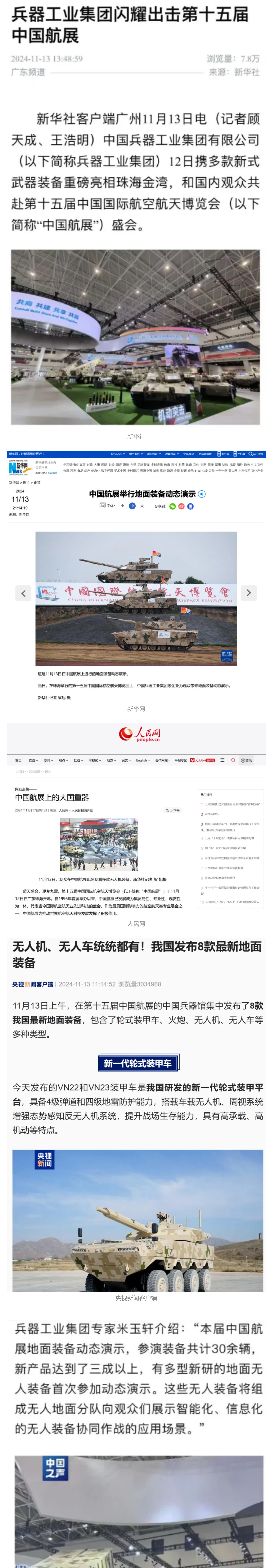 11月12日至17日,第十五屆中國(guó)國(guó)際航空航天博覽會(huì)在廣東省珠海市舉行,中國(guó)兵器工業(yè)集團(tuán)有限公司突出數(shù)智賦能軍貿(mào)合成旅作戰(zhàn)體系,帶來(lái)了一系列新產(chǎn)品、新技術(shù)、新體系,全方位展示我國(guó)陸軍外貿(mào)武器裝備發(fā)展最高水平、最新突破、最前沿成果,立體化呈現(xiàn)陸域信息化、智能化、體系化作戰(zhàn)能力,受到了全社會(huì)廣泛關(guān)注。航展期間,央視綜合頻道《新聞聯(lián)播》、央視新聞?lì)l道《新聞直播間》《長(zhǎng)空鵬程》報(bào)道兵器工業(yè)集團(tuán)參展情況,重點(diǎn)介紹了VT4A1主戰(zhàn)坦克、輪式裝甲火炮、新一代陸域指控信息系統(tǒng)、無(wú)人戰(zhàn)車(chē)、民用無(wú)人運(yùn)輸機(jī)及地面裝備演示有關(guān)內(nèi)容。央視新聞推出航展直播節(jié)目《藍(lán)天之約》,邀請(qǐng)兵器工業(yè)集團(tuán)嘉賓對(duì)參展情況、裝備動(dòng)態(tài)演示作了講解。