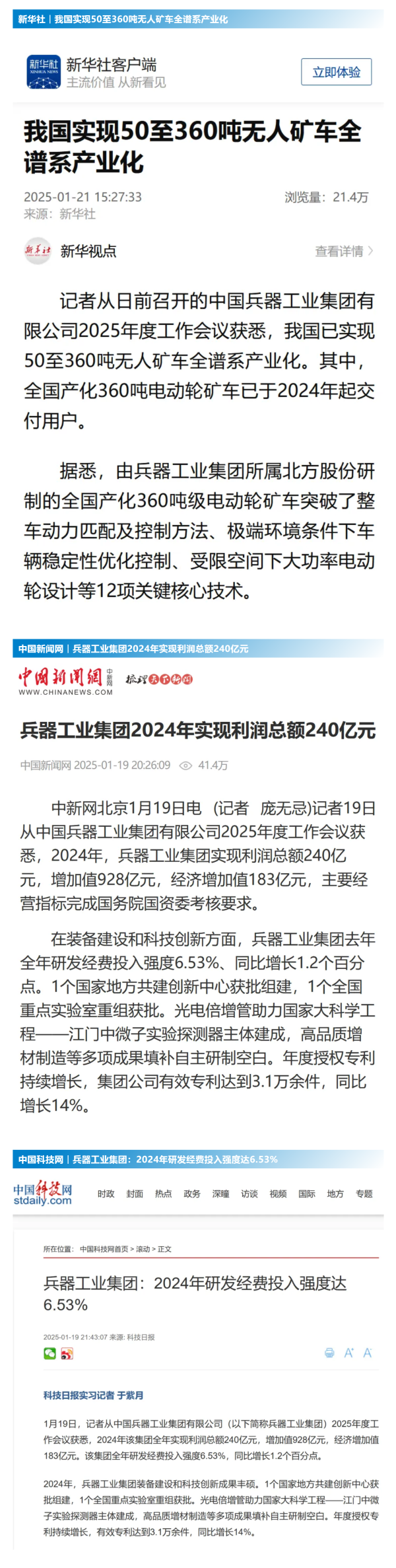 1月19日至20日,中國(guó)兵器工業(yè)集團(tuán)有限公司2025年度工作會(huì)議在京召開(kāi),會(huì)議總結(jié)2024年工作,分析形勢(shì)任務(wù),明確工作思路,部署2025年工作。 集團(tuán)公司2024年取得的成績(jī)及下一步重點(diǎn)工作受到社會(huì)媒體廣泛關(guān)注。新華社、中國(guó)新聞網(wǎng)、中國(guó)科技網(wǎng)、光明日?qǐng)?bào)客戶端、經(jīng)濟(jì)日?qǐng)?bào)客戶端、中國(guó)日?qǐng)?bào)網(wǎng)、國(guó)務(wù)院國(guó)資委網(wǎng)站、學(xué)習(xí)強(qiáng)國(guó)中央企業(yè)學(xué)習(xí)平臺(tái)、新浪網(wǎng)、網(wǎng)易網(wǎng)、搜狐網(wǎng)、騰訊網(wǎng)、鳳凰網(wǎng)等中央主流媒體、國(guó)家部委網(wǎng)站及知名網(wǎng)絡(luò)媒體對(duì)集團(tuán)公司2025年度工作會(huì)議進(jìn)行了報(bào)道,重點(diǎn)關(guān)注集團(tuán)公司經(jīng)營(yíng)業(yè)績(jī)、科技創(chuàng)新、產(chǎn)業(yè)結(jié)構(gòu)布局優(yōu)化等情況。其中,新華社以《我國(guó)實(shí)現(xiàn)50至360噸無(wú)人礦車全譜系產(chǎn)業(yè)化》為題,重點(diǎn)報(bào)道了集團(tuán)公司在推動(dòng)智能制造水平提升方面取得的成效;中國(guó)新聞網(wǎng)、光明日?qǐng)?bào)客戶端、經(jīng)濟(jì)日?qǐng)?bào)客戶端、中國(guó)日?qǐng)?bào)網(wǎng)等就集團(tuán)公司2024年度經(jīng)營(yíng)業(yè)績(jī)及各項(xiàng)工作取得的成果進(jìn)行報(bào)道;中國(guó)科技網(wǎng)著重報(bào)道了集團(tuán)公司在科技創(chuàng)新和優(yōu)化產(chǎn)業(yè)結(jié)構(gòu)布局方面的最新進(jìn)展。集團(tuán)公司門(mén)戶網(wǎng)站、微信公眾號(hào)、微博等新媒體平臺(tái)以及《中國(guó)兵工報(bào)》也對(duì)集團(tuán)公司工作會(huì)議進(jìn)行了及時(shí)報(bào)道,各成員單位紛紛對(duì)相關(guān)內(nèi)容進(jìn)行轉(zhuǎn)載,引發(fā)全系統(tǒng)關(guān)注。 集團(tuán)公司職工及廣大網(wǎng)友熱議工作會(huì) “2025年工作會(huì)為我們指明了發(fā)展方向、明確了奮斗目標(biāo),面對(duì)全新的機(jī)遇和挑戰(zhàn),作為兵工人深感責(zé)任重大?!?/p> “科技是第一生產(chǎn)力,一定要以科技創(chuàng)新引領(lǐng)新質(zhì)生產(chǎn)力發(fā)展,為高質(zhì)量發(fā)展提供支撐?!?/p> “把各項(xiàng)工作做深、做實(shí)、做細(xì),努力為集團(tuán)公司高質(zhì)量發(fā)展添磚加瓦?!?/p> “2024年中國(guó)兵器展示了大國(guó)重器,祝新的一年中再創(chuàng)輝煌!” |