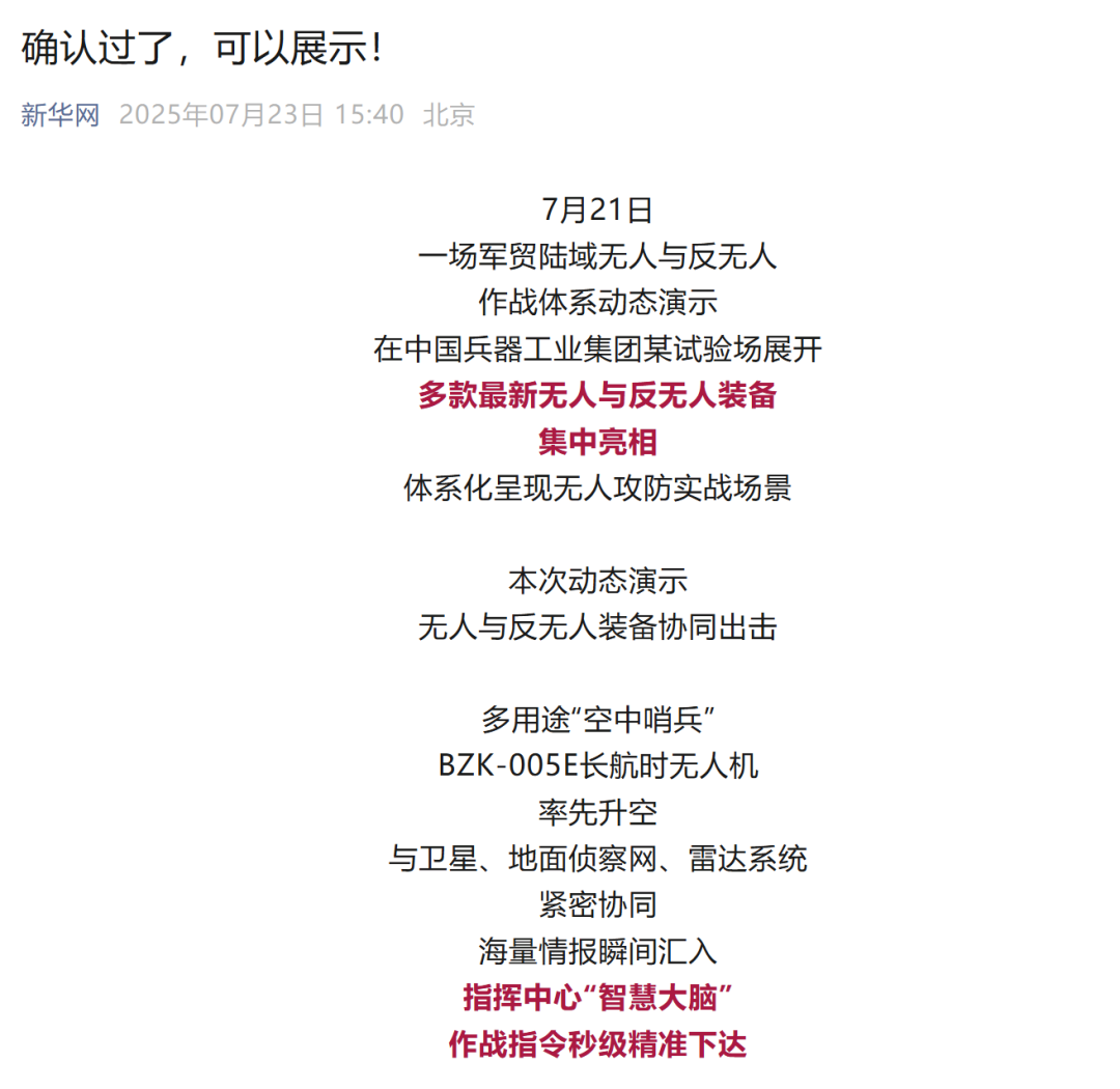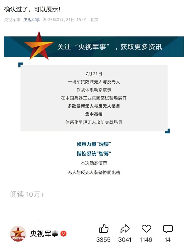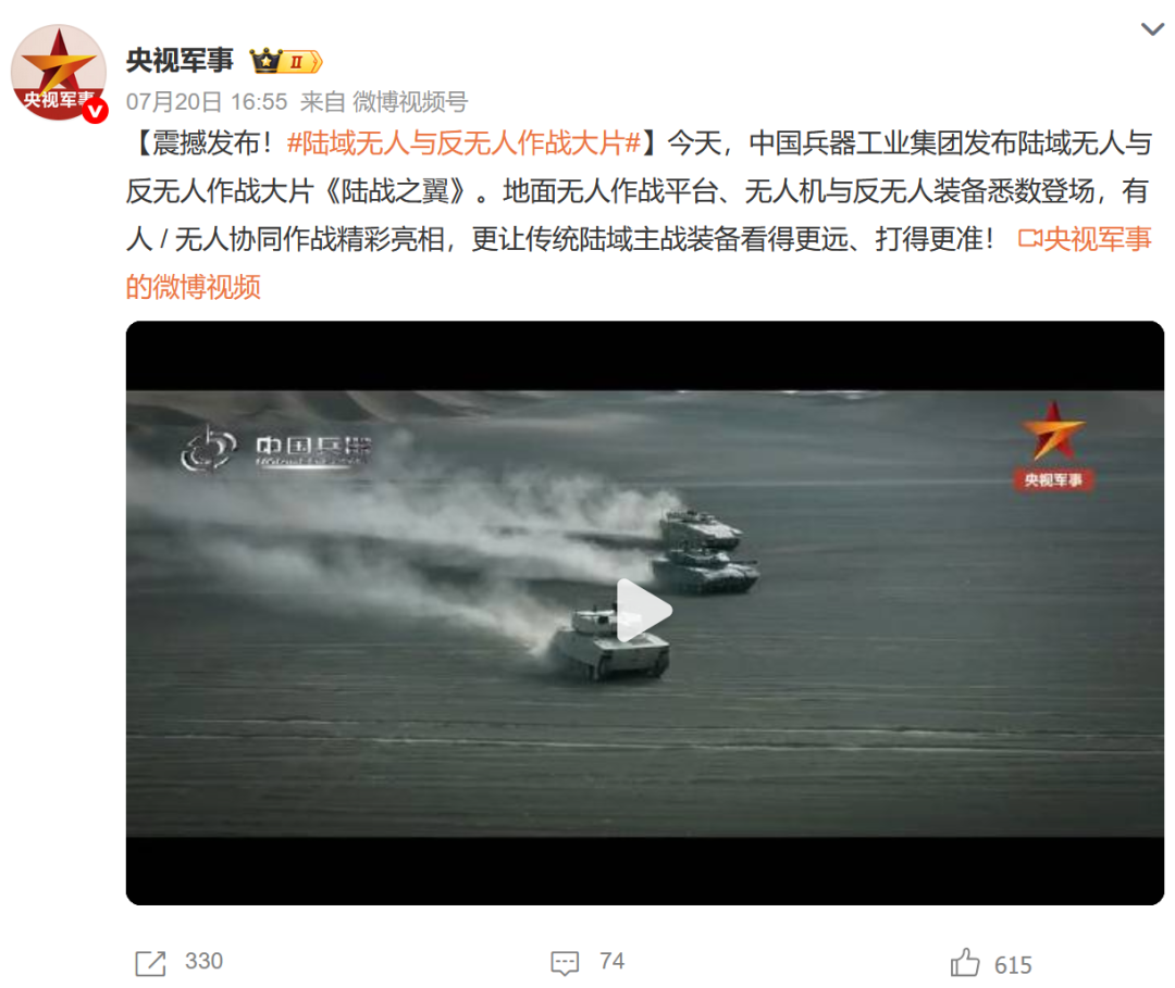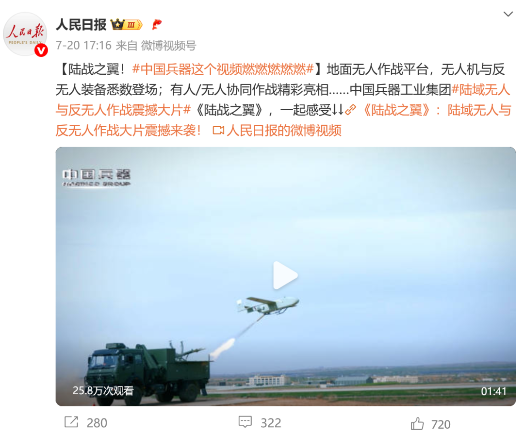 7月21日,中國(guó)兵器工業(yè)集團(tuán)有限公司在位于內(nèi)蒙古的某試驗(yàn)場(chǎng)舉辦軍貿(mào)陸域無人與反無人作戰(zhàn)體系主題日活動(dòng),攜無人機(jī)、巡飛彈、反無人機(jī)等最新武器裝備登場(chǎng)亮相,展現(xiàn)了一場(chǎng)無人與反無人領(lǐng)域激烈對(duì)抗的實(shí)戰(zhàn)場(chǎng)景。中央主流媒體、地方媒體、知名網(wǎng)絡(luò)媒體,以及集團(tuán)公司各宣傳平臺(tái)紛紛進(jìn)行報(bào)道,多次登上熱搜,引發(fā)廣泛關(guān)注。 央視新聞?lì)l道《新聞直播間》《東方時(shí)空》《24小時(shí)》、國(guó)防軍事頻道《正午國(guó)防軍事》《軍事報(bào)道》《國(guó)防軍事早報(bào)》、中文國(guó)際頻道《今日環(huán)球》、央視軍事新媒體等報(bào)道了集團(tuán)公司軍貿(mào)陸域無人與反無人作戰(zhàn)體系首次公開實(shí)裝動(dòng)態(tài)演示有關(guān)情況,重點(diǎn)介紹了無人與反無人作戰(zhàn)最新裝備。 央視新聞?lì)l道《新聞直播間》:內(nèi)蒙古 軍貿(mào)陸域無人與反無人作戰(zhàn)最新裝備亮相 央視新聞?lì)l道《新聞直播間》:內(nèi)蒙古 軍貿(mào)陸域無人與反無人作戰(zhàn)最新裝備亮相 記者探訪無人裝備展區(qū) 央視新聞?lì)l道《新聞直播間》:軍貿(mào)陸域無人與反無人作戰(zhàn)最新裝備亮相·記者探訪 最強(qiáng)“盾牌” 反無人機(jī)系統(tǒng)新升級(jí) 人民日?qǐng)?bào)微博、央視軍事微博、央視新聞客戶端、中國(guó)新聞網(wǎng)、中新社國(guó)是直通車抖音、環(huán)球網(wǎng)微博、環(huán)球時(shí)報(bào)(X平臺(tái)、英文版客戶端)、中國(guó)日?qǐng)?bào)網(wǎng)、央視軍事報(bào)道微博、中國(guó)軍號(hào)微博、中央廣播電視總臺(tái)“空天逐夢(mèng)”微信視頻號(hào)、共青團(tuán)中央B站、國(guó)資小新微博等中央主流媒體、國(guó)家部委的新媒體播發(fā)集團(tuán)公司陸域無人與反無人作戰(zhàn)大片等視頻作品。 人民日?qǐng)?bào)微博 央視軍事微博 人民日?qǐng)?bào)、新華網(wǎng)、央視軍事、央視新聞、中央廣播電視總臺(tái)中國(guó)之聲、中國(guó)新聞網(wǎng)、中國(guó)日?qǐng)?bào)網(wǎng)、中國(guó)日?qǐng)?bào)英文報(bào)刊《CHINA DAILY》、《科技日?qǐng)?bào)》、光明日?qǐng)?bào)客戶端、環(huán)球網(wǎng)、環(huán)球時(shí)報(bào)、人民日?qǐng)?bào)海外版-海外網(wǎng)、央視網(wǎng)、小央視頻、參考消息、瞭望東方周刊、共青團(tuán)中央、國(guó)資小新新媒體、新浪網(wǎng)、騰訊網(wǎng)、搜狐網(wǎng)、鳳凰網(wǎng)、網(wǎng)易網(wǎng)等中央主流媒體、國(guó)家部委的新媒體及知名網(wǎng)絡(luò)媒體對(duì)集團(tuán)公司軍貿(mào)陸域無人與反無人作戰(zhàn)體系主題日活動(dòng)進(jìn)行了圖文、音頻、視頻報(bào)道。 央視軍事微信 人民日?qǐng)?bào)微信 新華網(wǎng)微信 來源/各主流媒體 |