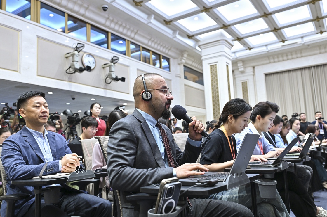 8月20日,國(guó)務(wù)院新聞辦公室在北京舉行新聞發(fā)布會(huì),閱兵領(lǐng)導(dǎo)小組辦公室副主任、中央軍委聯(lián)合參謀部作戰(zhàn)局少將副局長(zhǎng)吳澤棵,中國(guó)人民解放軍中部戰(zhàn)區(qū)閱兵指揮機(jī)構(gòu)辦公室常務(wù)副主任、政治工作部少將副主任徐貴忠介紹閱兵準(zhǔn)備工作有關(guān)情況,并答記者問。這是記者在現(xiàn)場(chǎng)提問。