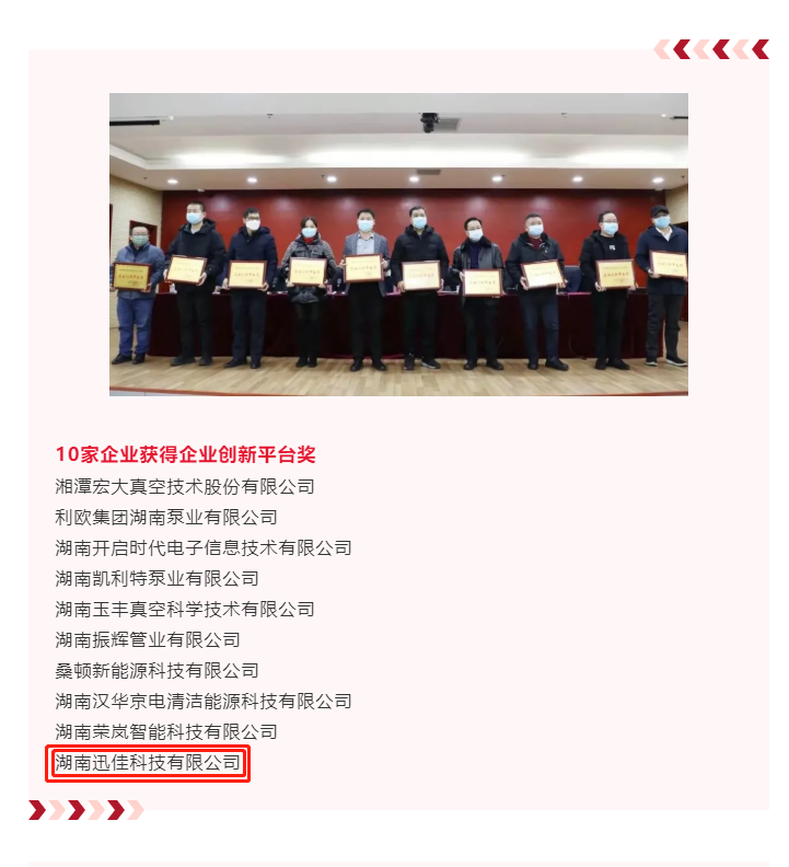 為進一步弘揚正氣,鼓勵先進,樹立標桿,充分發揮先進典型示范引領作用,湘潭經開區經濟工作會議對2021年高質量發展和安全生產先進企業、2021年先進基層黨組織、2021年真抓實干貢獻突出個人等進行了表彰,湖南迅佳科技有限公司(以下簡稱“迅佳科技”)榮膺年度“企業創新平臺獎”獎項。