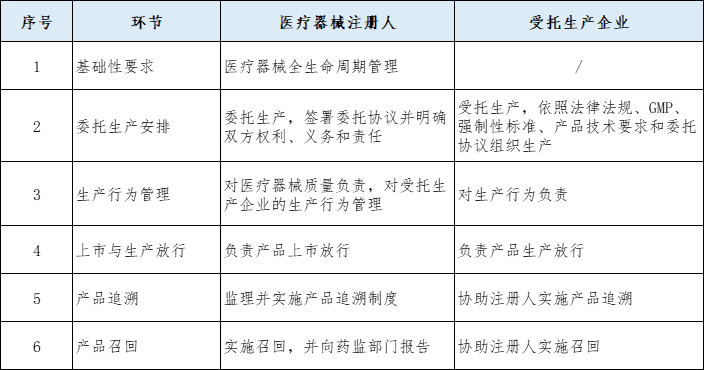 在醫(yī)療器械MAH制度下,明確了醫(yī)療器械注冊人和受托生產(chǎn)企業(yè)雙方的責(zé)任和義務(wù),由注冊人對醫(yī)療留城質(zhì)量安全負(fù)責(zé),負(fù)責(zé)產(chǎn)品上市放行,并對委托生產(chǎn)的醫(yī)療器械質(zhì)量負(fù)責(zé),由受托生產(chǎn)企業(yè)對生產(chǎn)行為負(fù)責(zé),負(fù)責(zé)產(chǎn)品生產(chǎn)放行,并接受委托方的監(jiān)管。具體而言,醫(yī)療器械注冊人與受托生產(chǎn)企業(yè)的權(quán)利義務(wù)劃分如下: