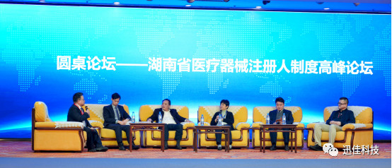 在高峰論壇上,湖南省藥品審評認(rèn)證與不良反應(yīng)監(jiān)測中心副主任彭慧芳宣講了“湖南省醫(yī)療器械審評審批制度改革概況”,全軍普通外科醫(yī)療專科中心副主任,主任醫(yī)師、北大醫(yī)療腫瘤診療中心主任醫(yī)師徐迎新教授分享了“轉(zhuǎn)化醫(yī)學(xué)平臺的建立與存在的問題”。迅佳科技杜曉東、上海漢盛蔣海洪、全軍普通外科醫(yī)療??浦行母敝魅涡煊隆⑨t(yī)道社社長湯國平、湘潭市市場監(jiān)督管理局局長莫秋華、湘潭市中心醫(yī)院副院長李紹杰就“湖南省醫(yī)療器械注冊人制度”的議題開展了圓桌論壇。