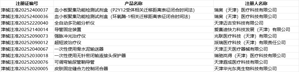 根據(jù)天津藥品監(jiān)督管理局2025年1-3月發(fā)布的醫(yī)療器械注冊(cè)數(shù)據(jù),共新增10個(gè)第二類醫(yī)療器械注冊(cè)證,涉及9家注冊(cè)人企業(yè)。