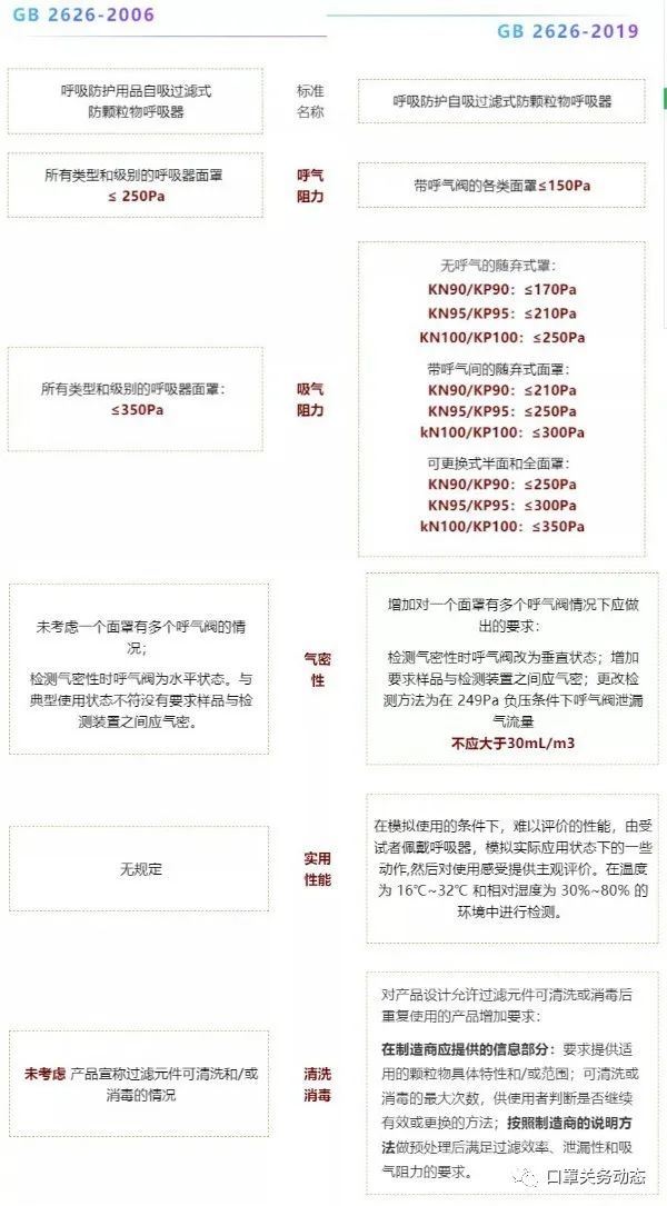 相對(duì)于2006版,在遵循科學(xué)性、規(guī)范性、協(xié)調(diào)性、時(shí)效性等基本原則的基礎(chǔ)上,根據(jù)科學(xué)進(jìn)步和產(chǎn)品發(fā)展的趨勢,在不降低防護(hù)能力的前提下調(diào)整呼吸阻力指標(biāo),完善檢測方法,優(yōu)化半口罩的下方視野,提高產(chǎn)品的舒適性。
