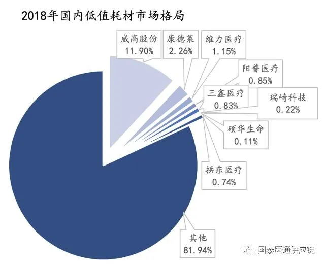 低值耗材市場格局分散:低值耗材細(xì)分種類繁多,國內(nèi)市場高度分散,僅威高醫(yī)療市場占比較高,達(dá)到11.9%,康德萊2.26%,維力醫(yī)療1.15%,其他廠家占比均不到1%。