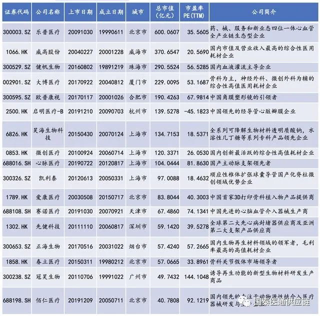 醫(yī)用耗材是醫(yī)療器械行業(yè)中市場占比約32%的重要細(xì)分領(lǐng)域,國內(nèi)行業(yè)增速約20%。由于我國在材料技術(shù)、產(chǎn)品設(shè)計(jì)和加工等方面的快速發(fā)展,高值耗材行業(yè)各個(gè)細(xì)分領(lǐng)域涌現(xiàn)了一批優(yōu)秀企業(yè),包括骨科植入物、血管介入器械、眼科耗材和生物活性材料等。目前,已有6家骨科植入物耗材企業(yè)、7家血管介入器械企業(yè)和5家眼科等其他高值耗材企業(yè),共計(jì)17家公司(微創(chuàng)醫(yī)療主營業(yè)務(wù)包括骨科和血管介入)在A股和港股上市。