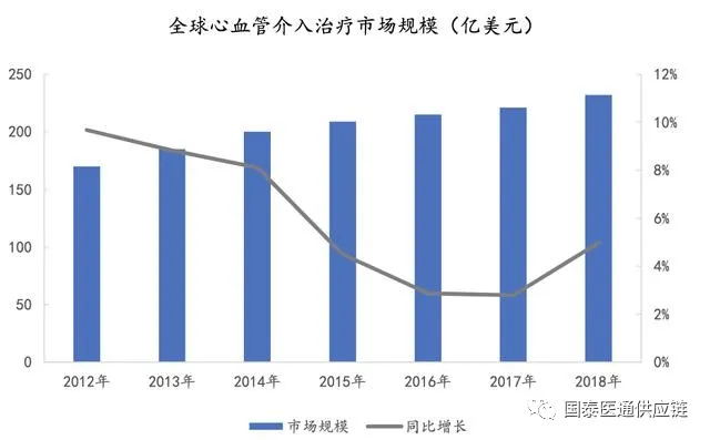 全球血管介入耗材:近年來市場規(guī)模增長放緩,增速保持在3-5%,2018年全球市場達(dá)232億美元。