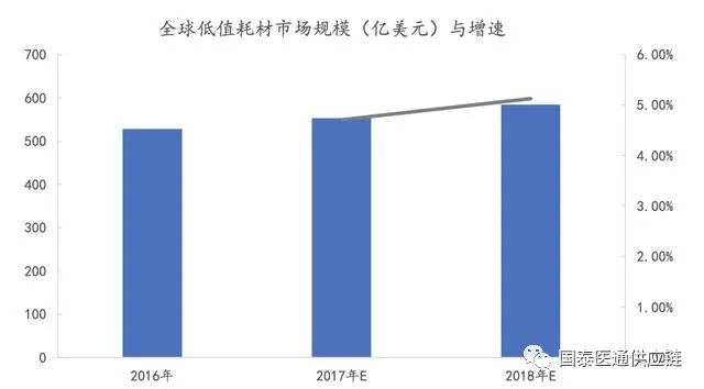 低值耗材全球市場:惠譽(yù)旗下研究機(jī)構(gòu)BMI Research在報(bào)告中分析,2016年全球低值醫(yī)用耗材市場規(guī)模約為528億美元,2017年和2018年市場規(guī)模將分別達(dá)到553億美元和581億美元,其中美國和歐洲市場最大,分別占約40%和30%。