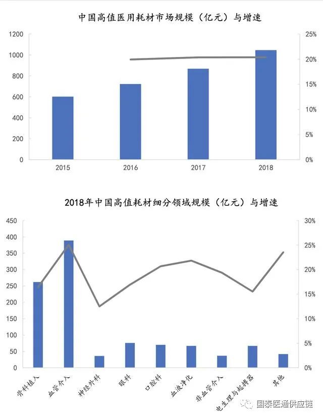高值耗材市場規(guī)模:近年,國內(nèi)市場規(guī)模增速保持在20%左右,2018年市場規(guī)模已超1000億元。