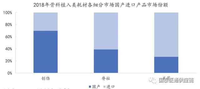 骨科植入物細(xì)分市場國產(chǎn)化程度:創(chuàng)傷市場國產(chǎn)化程度最高,國產(chǎn)企業(yè)占多數(shù)份額;其次是脊柱市場,隨著進(jìn)口替代的加快,國產(chǎn)企業(yè)市場份額逐步提升;國產(chǎn)化程度最低的是關(guān)節(jié)市場,目前依然是進(jìn)口企業(yè)占據(jù)主導(dǎo)地位。我國骨科醫(yī)療器械行業(yè)起步晚,技術(shù)存在不足,尤其是在高值骨科醫(yī)療器械方面,國內(nèi)企業(yè)普遍生產(chǎn)能力不足,難以滿足市場需求,因此主要依靠進(jìn)口。