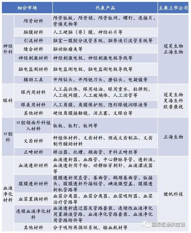國內(nèi)高值耗材上市企業(yè)的產(chǎn)品除了骨科和血管介入外,其他5家上市公司主要經(jīng)營產(chǎn)品有:神經(jīng)外科的生物膜補(bǔ)片;眼科的人工晶狀體、人工角膜和角膜接觸鏡;口腔科的口腔膜補(bǔ)片;血液凈化材料的血液灌流器及凈化器等。
