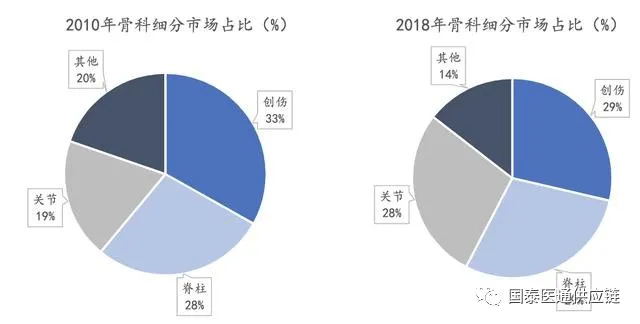 我國骨科細(xì)分市場:創(chuàng)傷、脊柱和關(guān)節(jié)產(chǎn)品占超85%的市場,其中創(chuàng)傷類產(chǎn)品因技術(shù)要求相對較低,發(fā)展較為成熟,而脊柱和關(guān)節(jié)類產(chǎn)品近年來發(fā)展迅速。2018年,脊柱類已經(jīng)超越創(chuàng)傷類成為市場份額最大的骨科品類,占比達(dá)到29.01%。