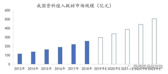 我國骨科植入類市場規(guī)模:由2013年的117億元增長至2018年的258億元,年復(fù)合增長率為17.14%,已成為世界第二大骨科植入物市場。未來隨著中國老年骨病如骨質(zhì)疏松、椎間盤突出、股骨頸骨折等的發(fā)病率持續(xù)上升,再加上人們對健康需求的增長和支付能力的提高,國內(nèi)骨科植入市場增速將遠(yuǎn)高于全球,未來5年有望繼續(xù)保持約15%的年復(fù)合增速。