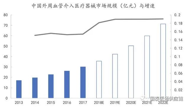 中國外周血管介入耗材:中國外周血管介入醫(yī)械市場從2013年的17億元增長到2017年的30億元,年復(fù)合增速達(dá)15.4%。隨著國產(chǎn)產(chǎn)品降價(jià)的推動(dòng),外周血管介入治療普及率將提升,預(yù)計(jì)到2022年國內(nèi)市場規(guī)模達(dá)71.2億元。