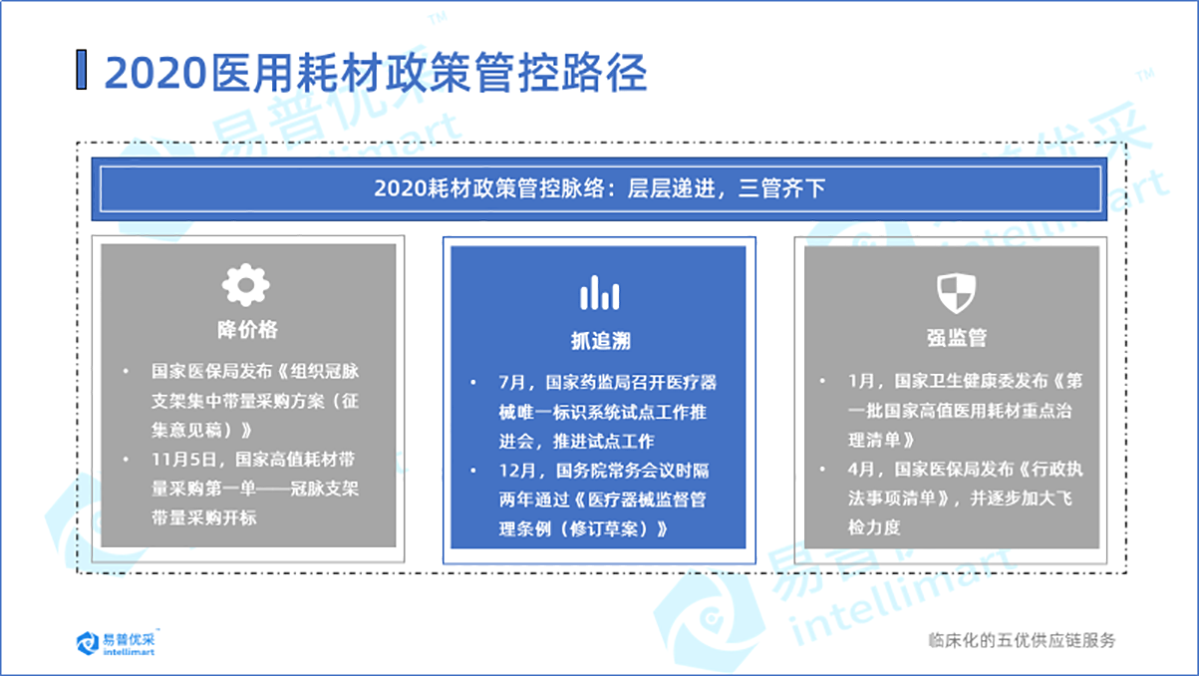 聚焦到2020年,醫(yī)用耗材的政策管控可概括為3條主線。第一條劍指“降價(jià)”:以帶量采購為核心,國家和地方齊頭并進(jìn),中國高值耗材行業(yè)正式進(jìn)入帶量采購時代;第二條緊抓“追溯”:持續(xù)推進(jìn)UDI試點(diǎn)工作,探索從源頭生產(chǎn)到最終臨床使用的全生命周期管理體系;