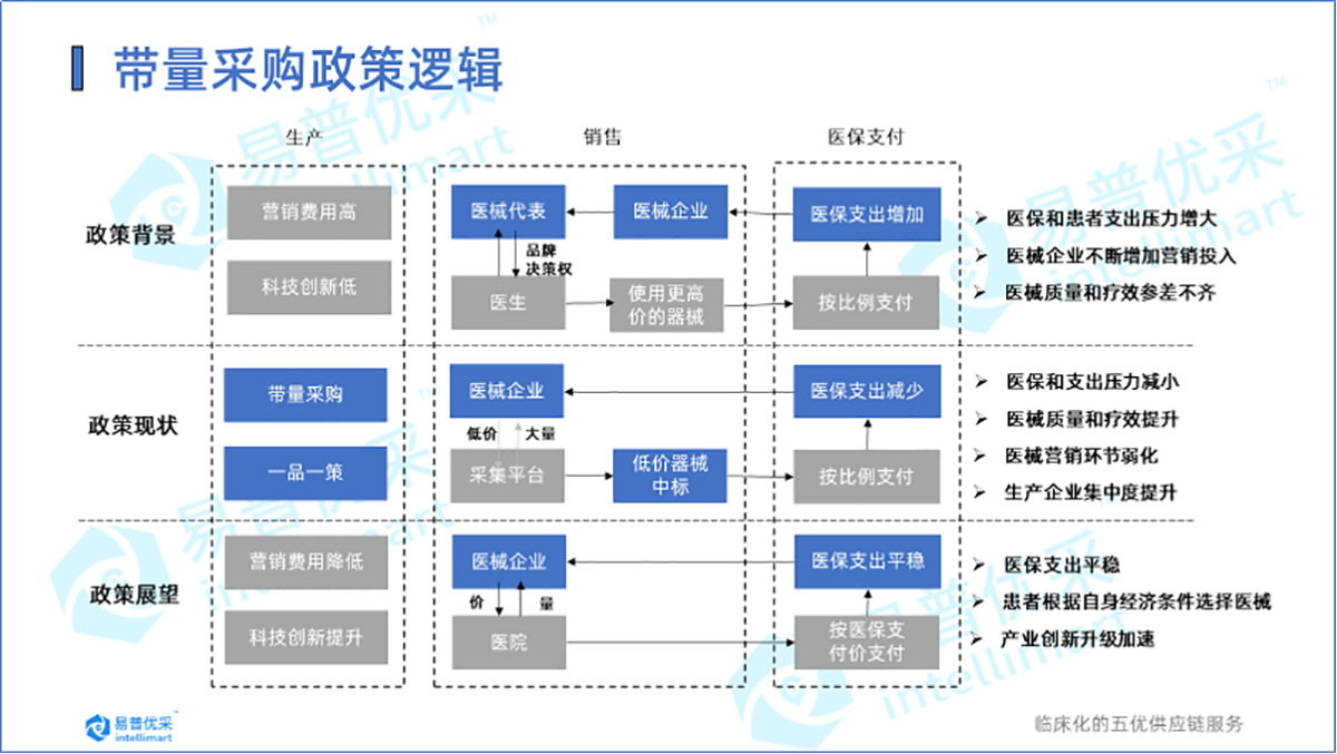 高值耗材帶量采購的政策邏輯與藥品相似,均是通過以量換價(jià),降低虛高價(jià)格,節(jié)省醫(yī)保資金。對于產(chǎn)業(yè)而言,械企憑借研發(fā)/生產(chǎn)/質(zhì)量控制/管理等綜合優(yōu)勢,在質(zhì)量能夠保證的前提下通過低價(jià)中標(biāo),由支付方——醫(yī)保保障量的落實(shí),減少渠道、終端推廣費(fèi)用,可將械企從無序的流通環(huán)節(jié)中解放出來,加強(qiáng)創(chuàng)新研發(fā),避免同質(zhì)競爭,引導(dǎo)產(chǎn)業(yè)創(chuàng)新升級。